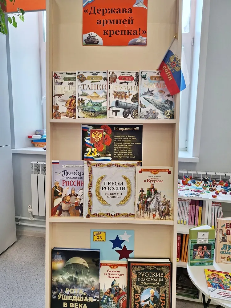 Некоторые ребята пришли в библиотеку с родителями и бабушками. В начале встречи библиотекарь рассказала детям об истории празднования Дня Защитника Отечества, который отмечается в России 23 февраля, ознакомила с выставкой книг «Держава армией крепка!».