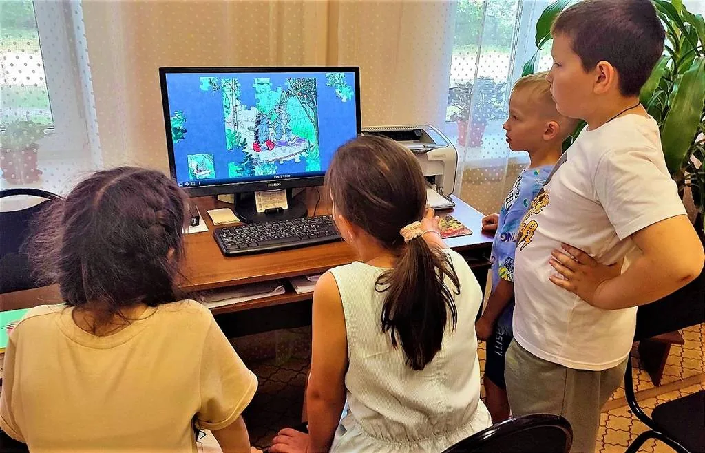 В первой части литературного занятия ребят познакомили с жизнью и творчеством Владимира Сутеева, рассказали, что он был не только писателем, но и иллюстратором и художником-мультипликатором. Знакомство со сказками Сутеева продолжилось громким чтением сказки «Палочка-выручалочка». Мальчики и девочки с большим интересом послушали сказку, все вместе обсудили прочитанное и сделали вывод, что сказки Владимира Сутеева учат доброте, трудолюбию, учат дружить, не быть жадными, приходить друзьям на помощь. Далее ребята увлеченно собирали интерактивные пазлы по сказкам В. Сутеева.