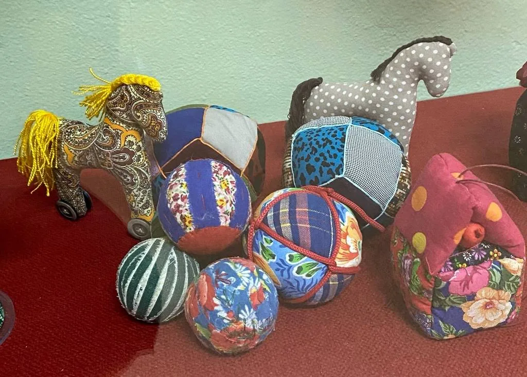 А также представлены на выставке мячики тряпичные традиционные и куколки игровые.