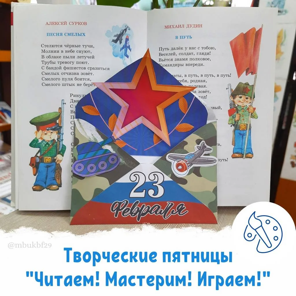 Вторая часть занятия была посвящена приближающемуся празднику – Дню защитника Отечества. Присутствующие узнали об истории и традициях празднования 23 февраля, прочитали детские стихи М. Дудина, А. Сурикова и других поэтов, а своими руками создали открытку для своих отцов, дедушек и братьев.