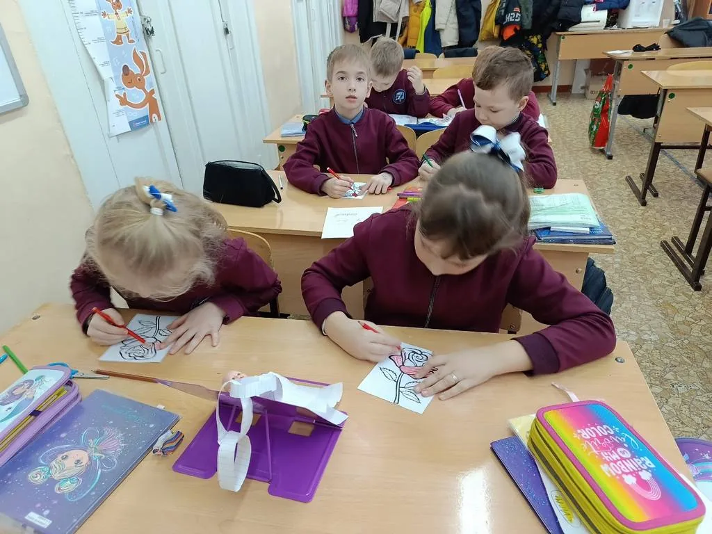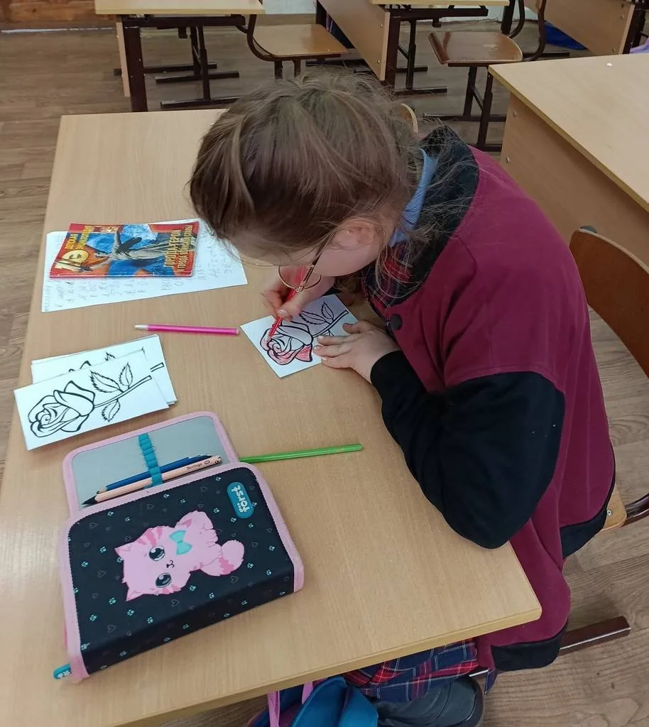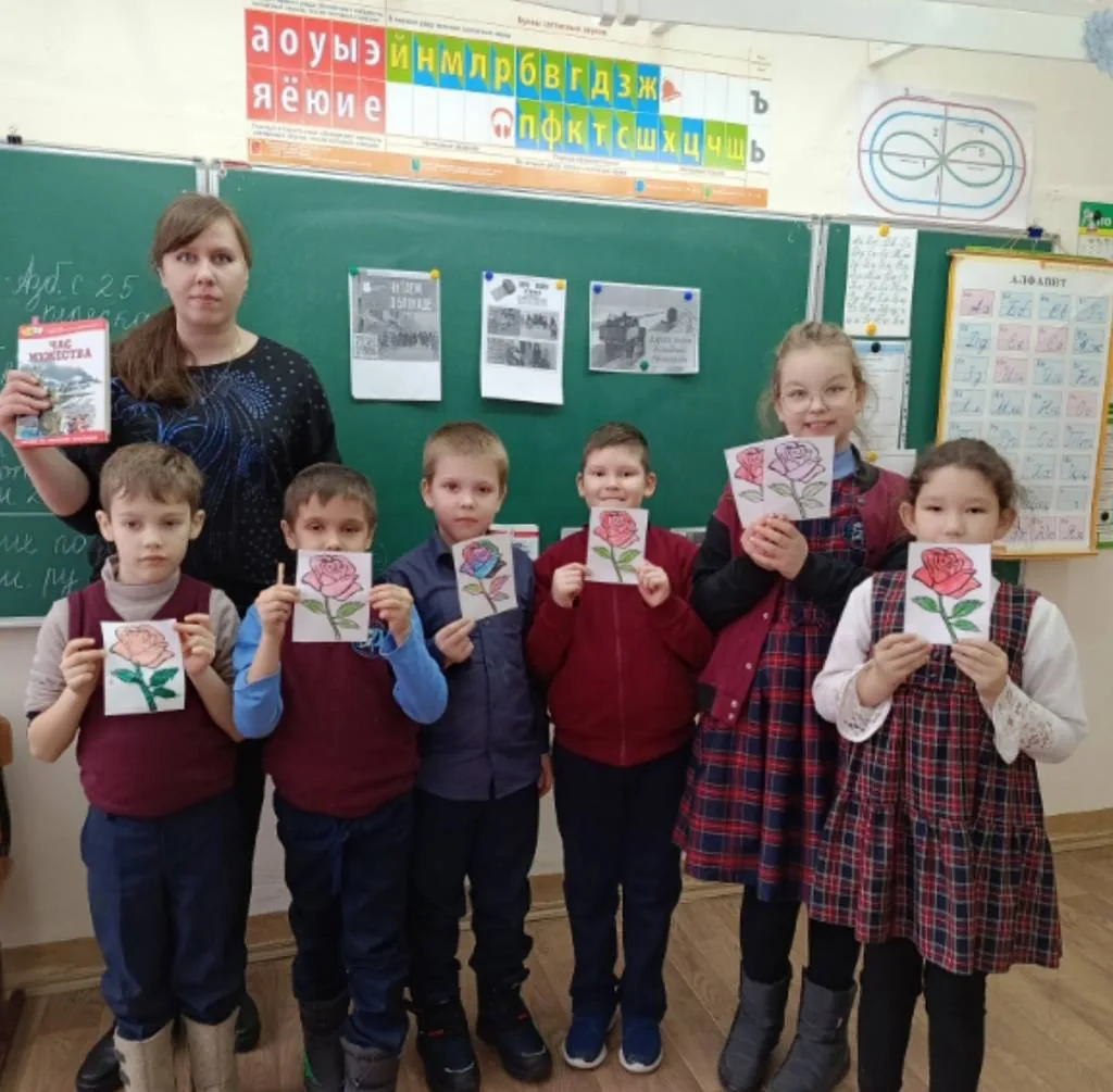 В конце мероприятия школьники выполнили коллективную работу «Цветы героям».