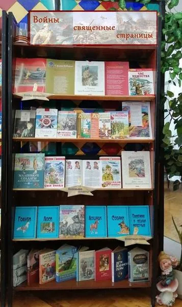 Выставка «Войны священные страницы» состоит из четырёхразделов. В первом разделе «Чтобы помнили» разместились книги, рассказывающие о событиях тех лет,о героях, о фактах Великой Отечественной войны. Второй раздел «Маленькие солдаты»,посвящена пионерам-героям:«Дети-герои ВОВ» А. Печерской, «Сын полка» В. Катаева, «Дети блокады» М. Сухачёва и др. Следующий раздел «Животные-герои», знакомит читателей с животными, которые наряду с людьми учувствовали в ВОВ и внесли свою лепту в Победу. Последний раздел выставки посвящён лучшим произведениям о войне для детей, среди них:рассказы Л. Кассиля, А. Митяева, С. Алексеева, Н. Богданова и других. Всем нашим защитникам, сегодняшним ветеранам и тем, кого с нами нет, мы обязаны тем, что живём сегодня под мирным, чистым небом. Вечная им слава!