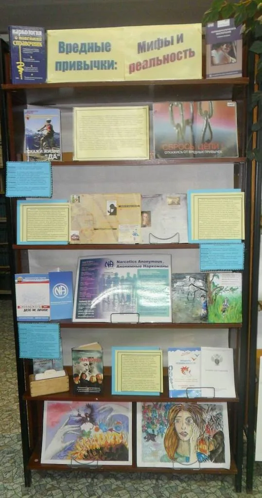 Выставочная работа отразилась в книжно-журнальной выставке «Наркообмания», тематических выставках «Как сказать наркотику «Нет»», «Вредные привычки: мифы и реальность». Материалы, представленные на них, помогают выявить причины и проблемы, из-за которых становятся наркоманами.